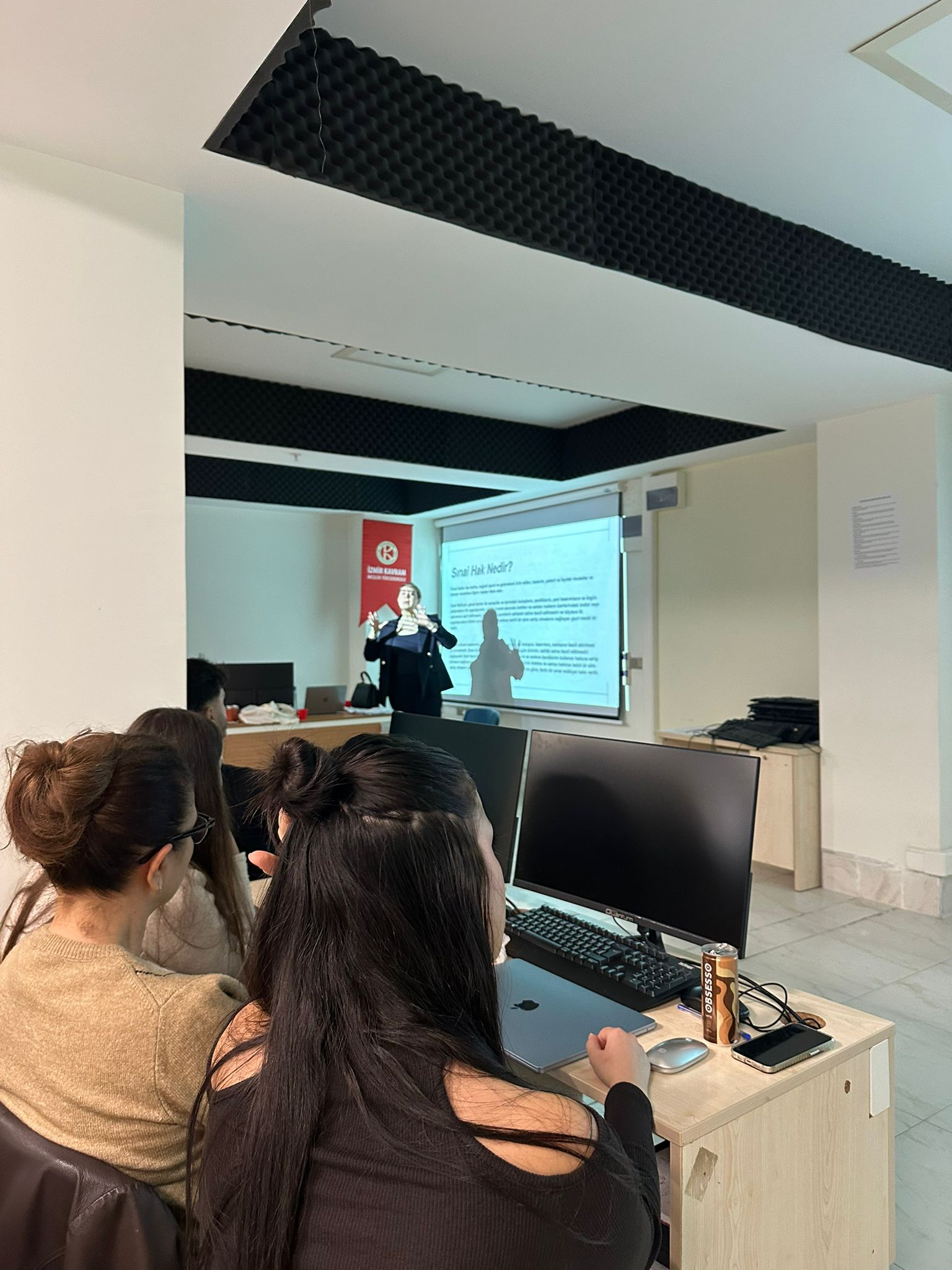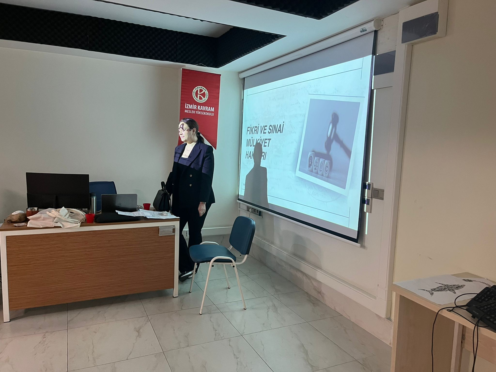 Öğrencilere profesyonel hayatta karşılaşabilecekleri hukuki süreçlere dair farkındalık kazandırmayı amaçlayan sunumda; marka tescilinin önemi, patent başvuru süreçlerinin nasıl işlediği ve hangi durumlarda gerekli olduğu ile telif haklarının tasarım, grafik ve içerik üretimi alanlarındaki rolü somut örneklerle açıklandı.