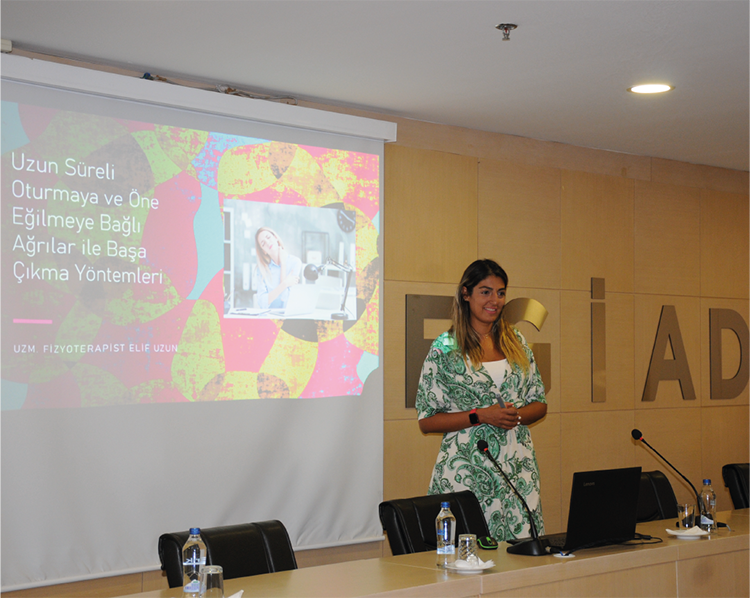 EGİAD (Ege Genç İş İnsanları Derneği) dernek merkezinde 26 Eylül 2022 tarihinde Ergonomi eğitimi ve workshop düzenlendi. Düzenlenen etkinlikte; ergonomi eğitimine ve workshop'una Fizyoterapi programı öğretim görevlisi Elif Uzun konuşmacı olarak katılım gösterdi. Öğretim görevlisi Elif uzun eğitim kapsamında; masa başında çalışanların, uzun süreli oturmaya ve öne eğilmeye bağlı oluşan ağrılarından, bu ağrılarla ve stresle nasıl baş edilebileceğinden, masa başında çalışan kişilerin bu problemleri minimalize etmek için ekran göz mesafesi , dirsek açısı, masa yüksekliği gibi ergonomik konuları nasıl optimize edebileceklerinden bahsetti. Ayrıca; Öğretim görevlisi Uzun, stres kaynaklı oluşan