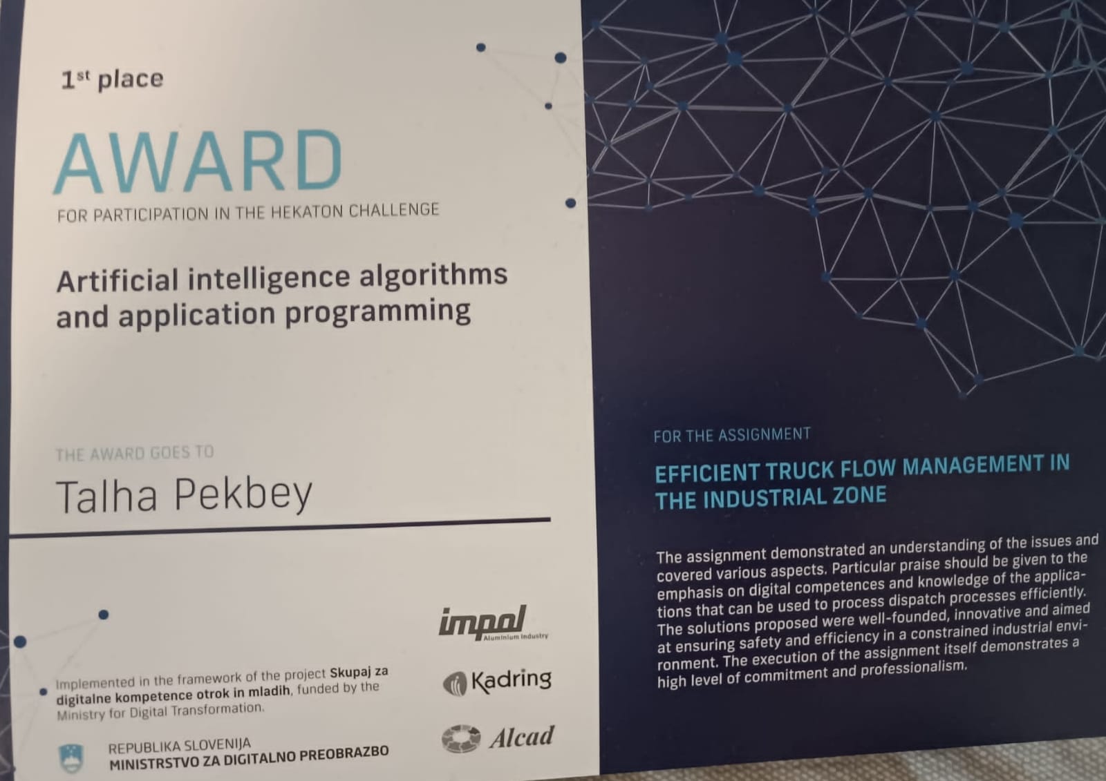 Gerçek hayata dair lojistik problemlerin çözülmesinin amaçlandığı yarışma, Slovenya Dijital Dönüşüm Bakanlığı tarafından finanse edildi. Yarışma kapsamında, Impol Alüminyum Endüstrisi adlı firmayı inceleyen Talha ve Cian, firmanın kronikleşmiş bir lojistik problemini tespit ettikten sonra yenilikçi çözümler önerdikleri "Efficient Truck Flow Management in the Industrial Zone" başlıklı projeleriyle 30 ekip arasından birinci seçildiler.